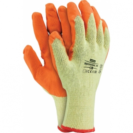 RAW-POL RECODRAG to wytrzymałe rękawice ochronne wykonane z dzianiny bawełniano-poliestrowej (ścieg 10), powlekane lateksem. Zakończone ściągaczem, odporne na rozdarcia i pęknięcia, trudnościeralne i odporne na zużycie. Przeznaczone do intensywnych prac w budownictwie, logistyce, przemyśle transportowym i mechanice.