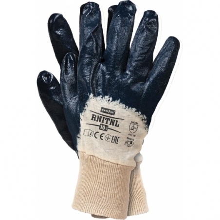 Rękawice ochronne powlekane nitrylem, zakończone dzianinowym ściągaczem.