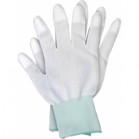 Rękawice ochronne wykonane z nylonu powlekane na końcówkach palców z jednostronnym mikronakropieniem. - końcówki palców pokryte poliuretanem - mikronakropienie z PCV na części dłonicowej zapewnia dobrą chwytność podczas przenoszenia towarów, a także zwiększa trwałość rękawicy - zakończone ściągaczem - elastyczne, dzięki czemu świetnie dopasowują się do dłoni - rozciągliwe i wytrzymałe, mimo iż są cienkie - odporne na rozdarcie - zapewniają manualność oraz doskonałe czucie trzymanego przedmiotu - zgodne z normami EN388 (przykładowe poziomy odporności: 3 1 1 1) i EN420