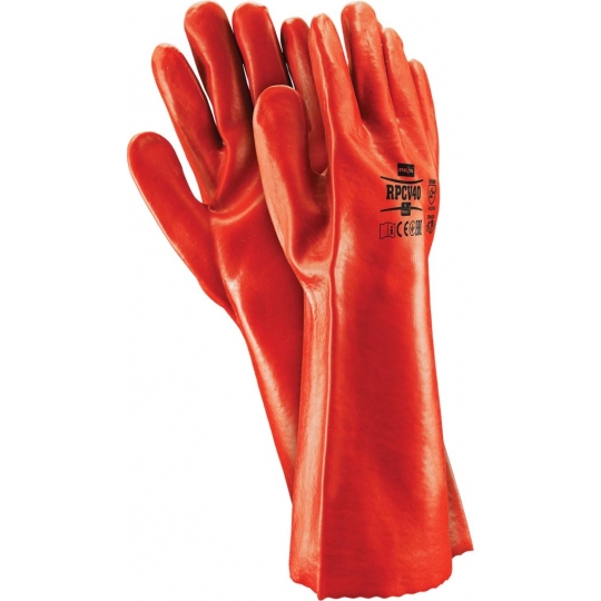 Rękawice ochronne wykonane z PCV, zakończone mankietem. - oblewane PCV zarówno po stronie wewnętrznej jak i zewnętrznej - zakończone również powlekanym mankietem, dzięki czemu rękawica osiąga długość 40 cm i chroni o wiele większy obszar ręki - odznaczają się odpornością na ścieranie - zapewniają manualność oraz zachowują miękkość - stosowane do ogólnych prac mechanicznych - zgodne z normami EN388 (przykładowe poziomy odporności: 4 1 2 1 X) i EN420