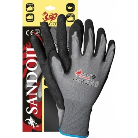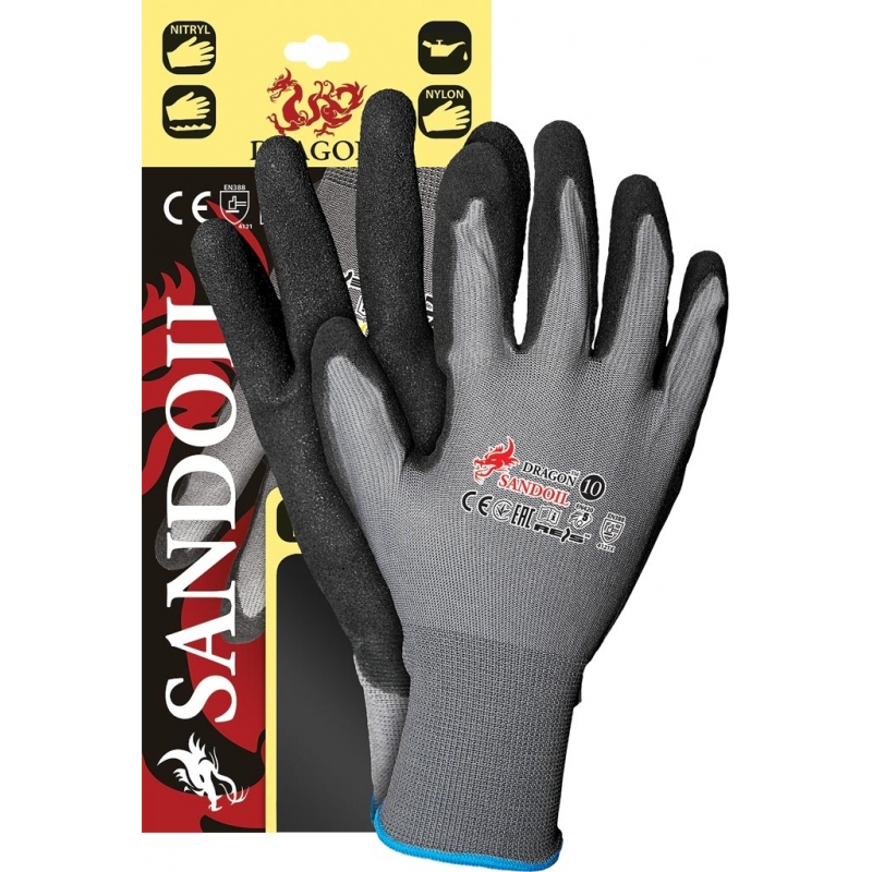 Rękawice ochronne wykonane z nylonu, powlekane nitrylem w czarnym kolorze. - podwójna warstwa nitrylowej powłoki typu SANDY FINISH zapewnia doskonałą przyczepność przy zaolejonych powierzchniach - zakończone ściągaczem - charakteryzują się zwiększoną odpornością na ścieranie i przetarcie - porowata struktura powleczenia zapewnia doskonałą chwytność, nie powodując usztywnienia rękawicy, co pozwala zachować sprawność i elastyczność - nitryl zwiększa odporność na smary, oleje, tłuszcze i węglowodory - wykorzystywane do ogólnych prac mechanicznych - zgodne z normami EN388 (poziomy odporności: 4 1 2 1) i EN420
