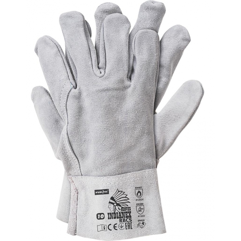 Rękawice ochronne wykonane w całości ze skóry bydlęcej. - skóra bydlęca dwoinowa - całodłonicowe - część chwytna rękawicy wykonana z jednego kawałka skóry, dzięki czemu wykazują większą wytrzymałość i odporność na przetarcia - całoskórzane, czyli w całości wykonane ze skóry, włącznie z mankietem - popularnie stosowane do ogólnych prac mechanicznych - wykorzystywane w budownictwie, przemyśle ciężkim - zgodne z normami EN388 (poziomy odporności: 4 1 3 3 X), EN407 (poziomy odporności: 4 1 2 X 2 X) i EN420