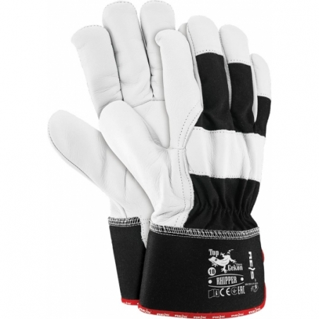 Rękawice ochronne wykonane ze skóry koziej. - skóra kozia licowa w jasnych kolorach - drelich i usztywniony mankiet w kolorze czerwonym, czarnym lub szarym - całodłonicowe - część chwytna rękawicy wykonana z jednego kawałka skóry, dzięki czemu wykazują większą wytrzymałość i odporność na przetarcia - od wewnątrz wypodszewkowane, co podnosi komfort użytkowania - popularnie stosowane do ogólnych prac mechanicznych - wykorzystywane w budownictwie, przemyśle ciężkim