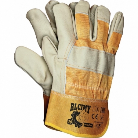 Rękawice ochronne wzmacniane skórą bydlęcą. - skóra bydlęca licowa w jasnych kolorach - drelich usztywniony, kauczukowy mankiet w kolorze żółtym - całodłonicowe - część chwytna rękawicy wykonana z jednego kawałka skóry, dzięki czemu wykazują większą wytrzymałość i odporność na przetarcia - od wewnątrz wypodszewkowane, co podnosi komfort użytkowania - popularnie stosowane do ogólnych prac mechanicznych - wykorzystywane w budownictwie, przemyśle ciężkim