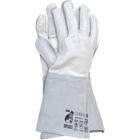 Rękawice spawalnicze w całości wykonane ze skóry. - skóra bydlęca dwoinowa połączona z licową - długość 35 cm - całodłonicowe - część chwytna oraz wierzchnia wykonana z jednego kawałka wysokiej jakości skóry bydlęcej licowej, rękawice wykazują większą wytrzymałość i odporność na przetarcia - całoskórzane, włącznie z mankietem wykonanym ze skóry dwoinowej do połowy przedramienia, chroniąc przed przemiękaniem oraz zabezpieczając nadgarstek przed urazami - stosowane w miejscach, gdzie istnieje ryzyko iskrzenia - popularnie stosowane do ogólnych prac mechanicznych, w budownictwie, przemyśle ciężkim - zgodne z normami EN388 (3 1 3 2 X), EN407 (4 1 3 X 4 X) oraz EN12477 TYP A