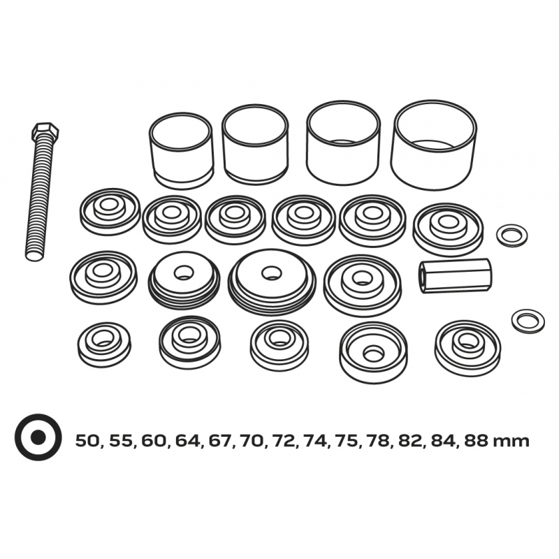Zestaw do montażu i demontażu łożysk i tulei. W zestawie trzpienie prowadzące: 32 i 38 mm, talerzyki wyciskające: 50, 55, 60, 64, 67, 70, 72, 74, 75, 78, 82, 84, 88mm