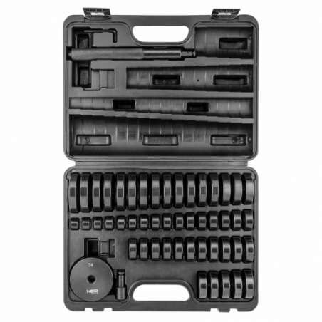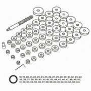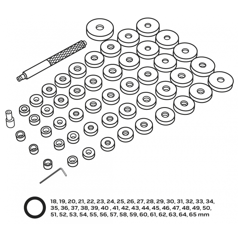 Zestaw do osadzania łożysk, uszczelniaczy i łącznikow gumowych. W zestawie: talerz wsporczy o średnicy 74 mm48 talerzyków roboczych:18, 19, 20, 21, 22, 23, 24, 25, 26, 27, 28, 29, 30, 31, 32, 33, 34, 35, 36, 37, 38, 39, 40 , 41, 42, 43, 44, 45, 46, 47, 48, 49, 50, 51, 52, 53, 54, 55, 56, 57, 58, 59, 60, 61, 62, 63, 64, 65 mm,radełkowany trzpień do osadzania elementów za pomocą młotkaklucz sześciokątny 3 mm.