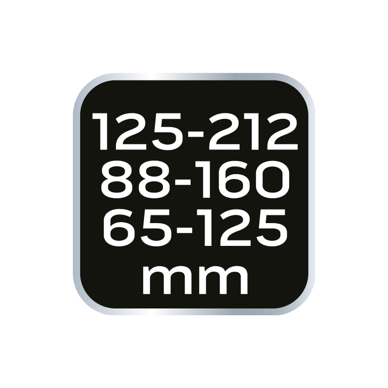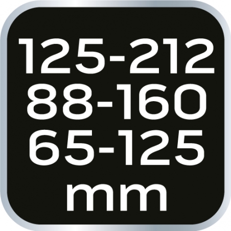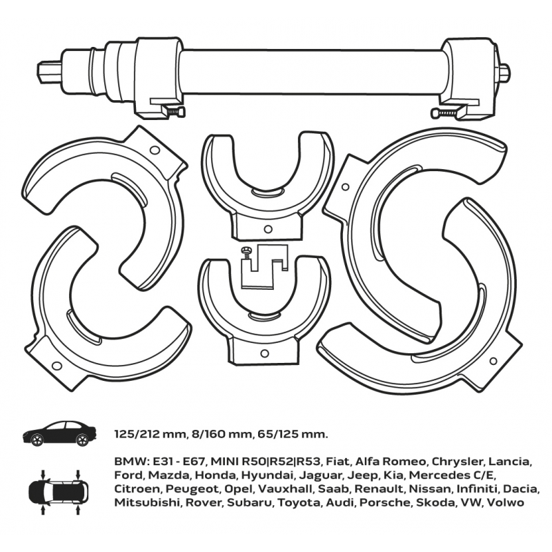 Ściągacz do sprężyn z wymiennymi końcówkami. 3 pary szczęk: 125/212 mm, 8/160 mm, 65/125 mm. BMW: E31 - E67, MINI R50|R52|R53, Fiat, Alfa Romeo, Chrysler, Lancia, Ford, Mazda, Honda, Hyundai, Jaguar, Jeep, Kia, Mercedes C/E, Citroen, Peugeot, Opel, Vauxhall, Saab, Renault, Nissan, Infiniti, Dacia, Mitsubishi, Rover, Subaru, Toyota, Audi, Porsche, Skoda, VW, Volvo. Do przednich i tylnych sprężyn. Szczęki posiadają plastikowe ochraniacze. System samoczynnego blokowania się na ściskanej sprężynie. Nadaje się do sprężyn stożkowych.