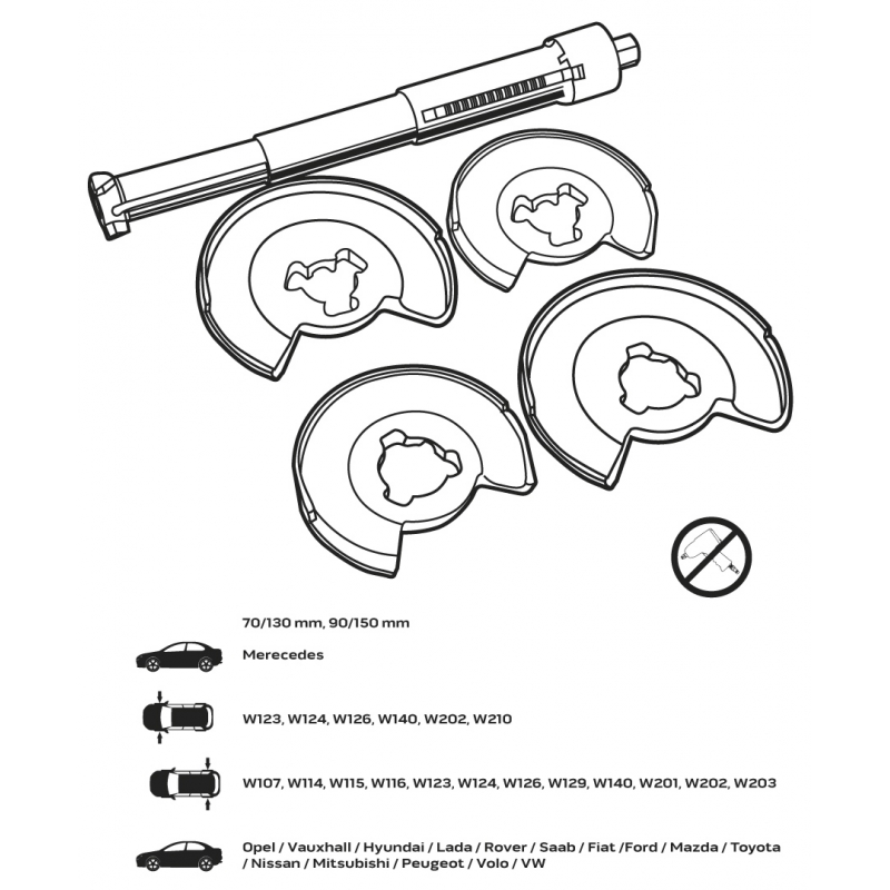 Ściągacz do sprężyn, teleskopowy, rozmiar 70/130 mm ; 90/150mm. Merecedes: przednie spręzyny - W123, W124, W126, W140, W202, W210; tylne sprężyny - W107, W114, W115, W116, W123, W124, W126, W129, W140, W201, W202, W203; oraz wybranych modeli: Opel, Vauxhall, Hyundai, Lada, Rover, Saab, Fiat,Ford, Mazda, Toyota, Nissan, Mitsubishi, Peugeot, Volvo, VW. Nie używać klucza udarowego do napędu ściągacza