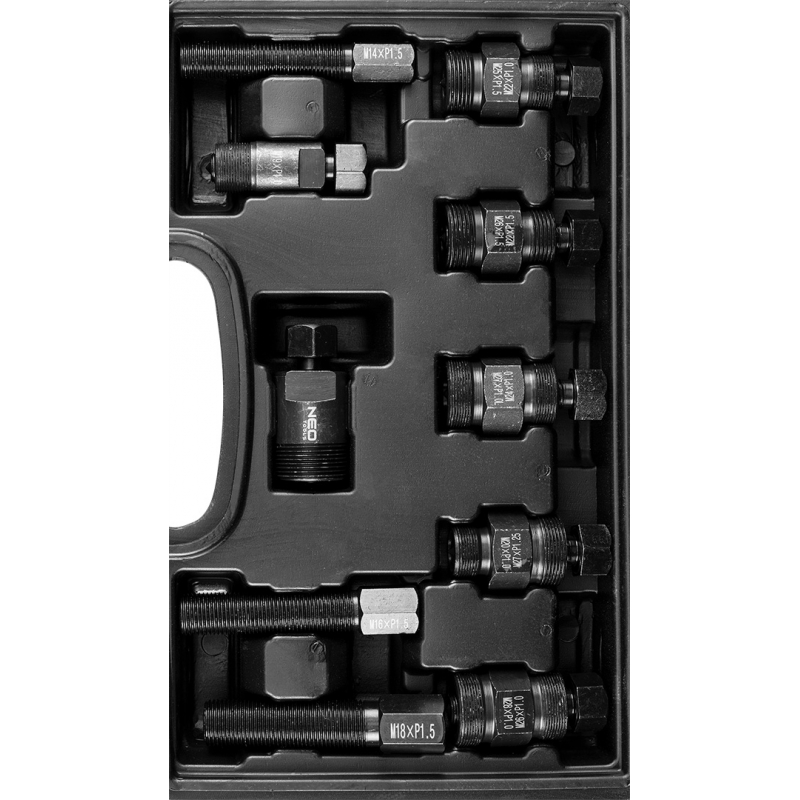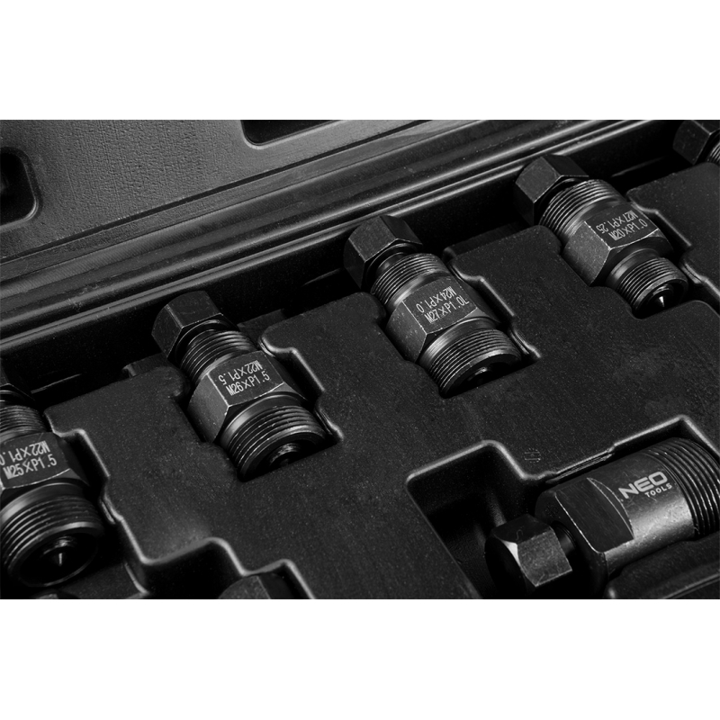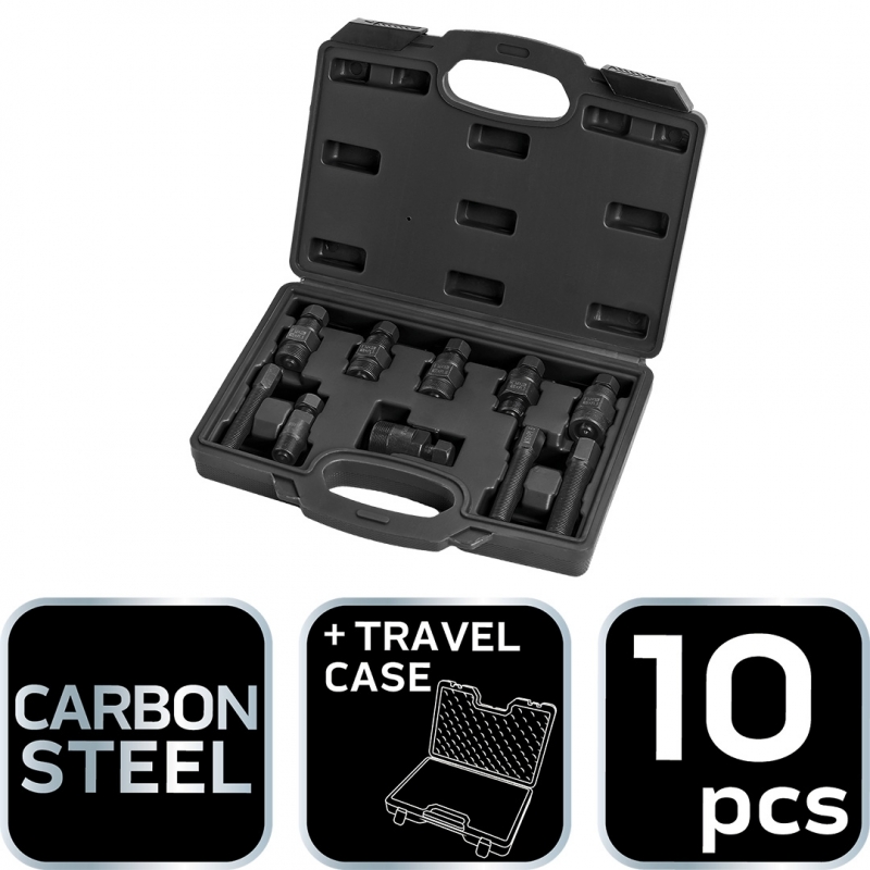 Ściągacze do kół zamachowych, zestaw 10 szt., służy do oddzielania koła zamachowego od stożka wału korbowego, pasuje do większości marek motocykli, gwinty prawe: M14 x P1,5 - R, M16 x P1,5 - R, M18 x P1,5 - R, M19 x P1.0 - R, M20 x P1.0 - R, M22 x P1.0 - R, M22 x P1,5 - R, M24 x P1.0 - R, M25 x P1,5 - R, M26 x P1.0 - R, M26 x P1,5 - R, M28 x P1.0 - R, M27 x P1.25 - R, M28 x P1,5 - R, gwint lewy: M27 x P1.0 - L;