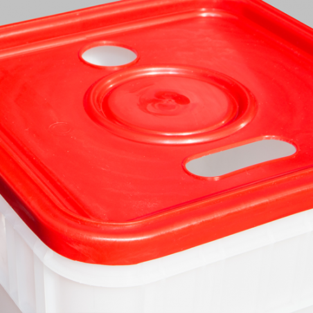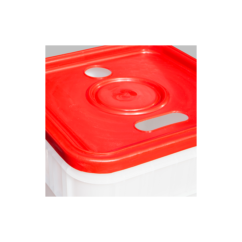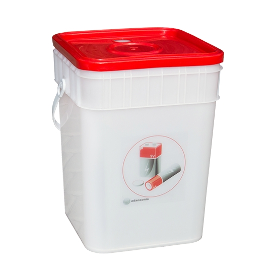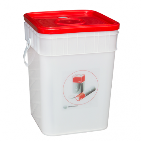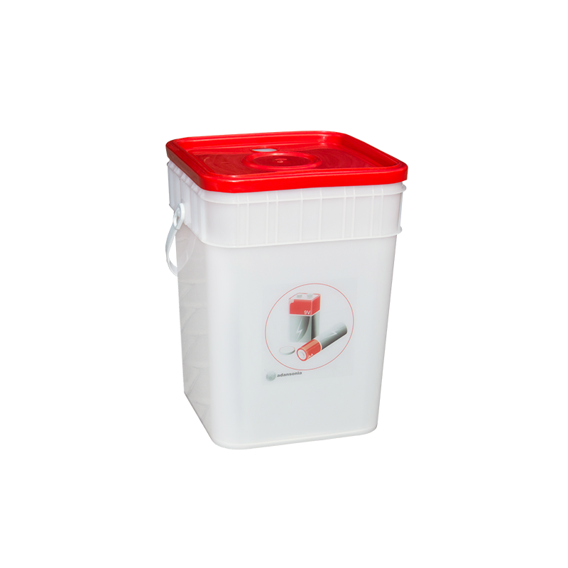 Pojemnik na zużyte baterie z otworem wrzutowym u góry. Bezpieczna rączka umożliwiająca przenoszenie pojemnika oraz ściągana pokrywa w celu opróżnienia zawartości pojemnika.