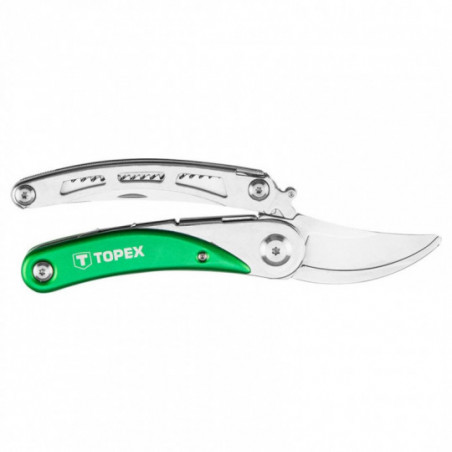 Narzędzie wielofunkcyjne, sekator: ostry nóz, piła do drewna, sekator z blokadą zamknięcia, pierścień na sznur.Waga narzędzia 265 g, długość po złożeniu 130 mm, długość po rozłożeniu 185 mm. Ostrza wykonane ze stali 440.