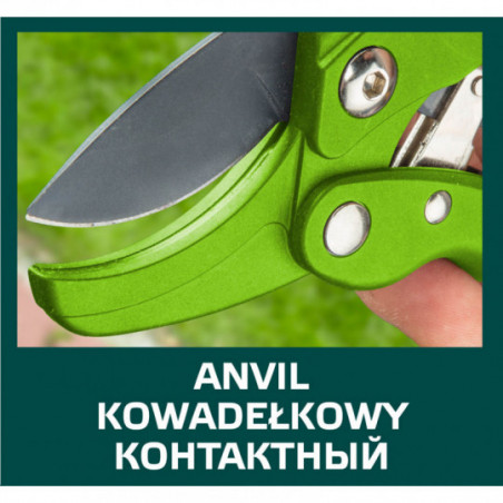 Sekator ogrodowy kowadełkowy 190 mm, maksymalna średnica cięcia 20 mm, pokrycie PTFE, mechanizm zapadkowy ułatwiający cięcie, uchwyty z włóna szklanego, antypoślizgowy uchwyt