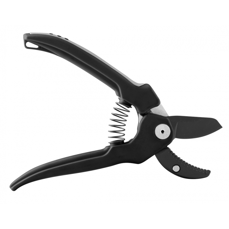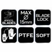Sekator kowadełkowy, regulowany rozstaw, długość całkowita 185 mm, maksymalna średnica cięcia 15 mm, regulowany rozstaw ostrzy, ostrza z powłoką nieprzywierającą, ergonomiczny uchwyt z miękkimi elementami, ostrze kowadełkowe do twardego i suchego drewna,