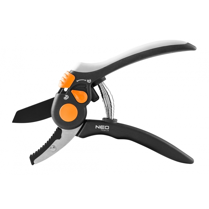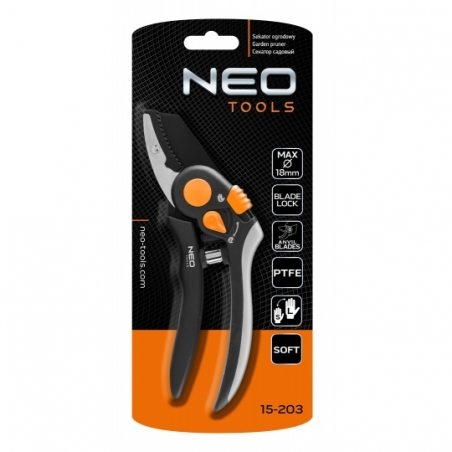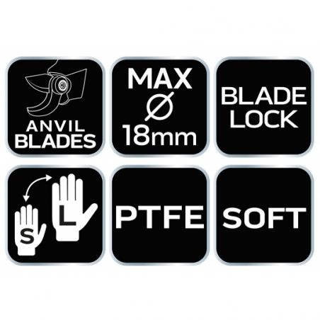 Sekator kowadełkowy, długość całkowita 200 mm, maksymalna średnica cięcia 18 mm, ergonomicznie ukształtowany uchwyt z miękkimi gumowymi uchwytami TPR dla lepszego chwytu i komfortu, Łatwa i bezpieczna blokada kciukiem dla prawej i lewej ręki, regulowany rozstaw ostrzy, ostrza z wysokiej jakości hartowanej stali, ostrza z powłoką nieprzywierającą, ostrze kowadełkowe do twardego i suchego drewna,