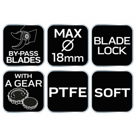 Sekator by-pass, długość całkowita 200 mm, maksymalna średnica cięcia 18 mm, ergonomicznie ukształtowany uchwyt z miękkimi gumowymi uchwytami TPR dla lepszego chwytu i komfortu, łatwa i bezpieczna blokada kciukiem dla prawej i lewej ręki, przekładnia znacznie ułatwia cięcie, ostrza z wysokiej jakości hartowanej stali, ostrza z powłoką nieprzywierającą, ostrze do świeżego drewna,