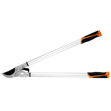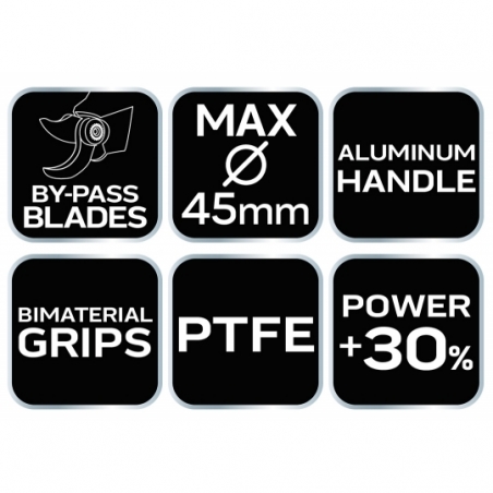 Sekator do gałęzi by-pass, długość całkowita 710 mm, maksymalna średnica cięcia 45 mm, przekładnia dźwigni zwiększa moc cięcia o 30%, ostrza z powłoką nieprzywierającą, aluminiowe ramiona, uchwyty dwumateriałowy antypoślizgowy, ostrze do świeżego drewna,