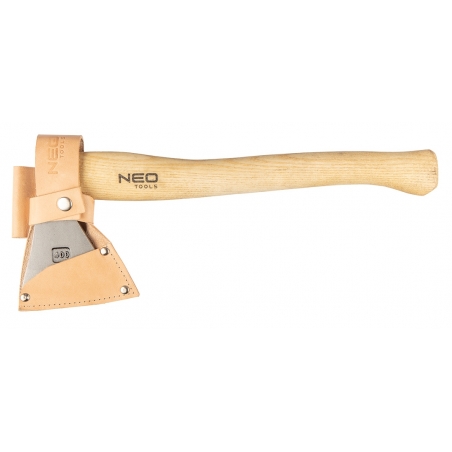 Toporek bushcraftowy waga 400g, pouch skórzany, uchwyt jesionowy, stal węglowa C55, HRC 50-55, kuty matrycowo, ostrze polerowane