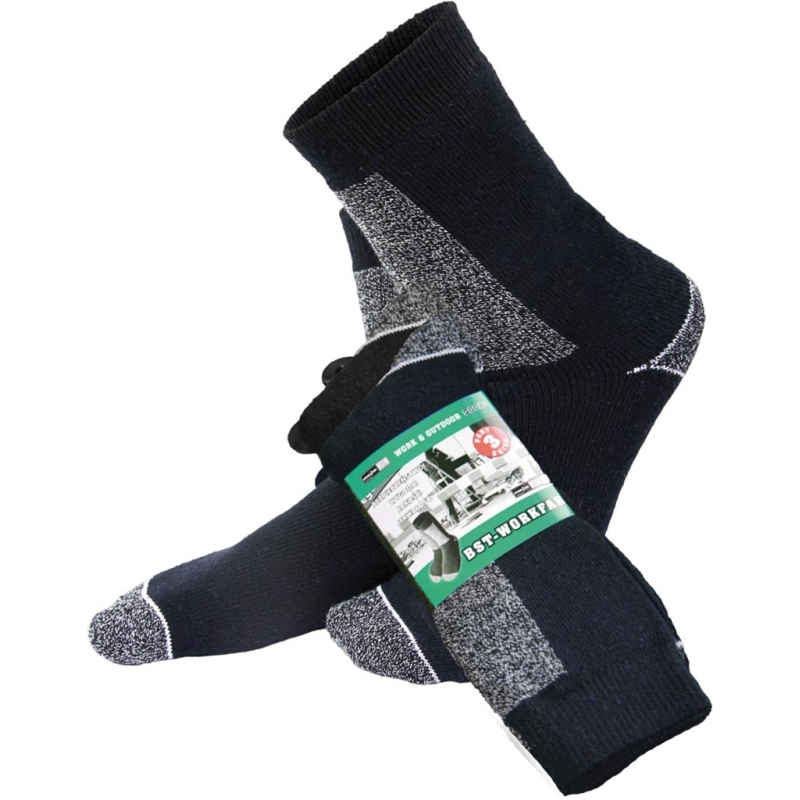 Skarpety do pracy i codziennego użytku. - 50% bawełna, 45% poliester, 5% elastyna - dostępne dwa kolory: granatowy (2 pary) oraz czarny (1 para) - obydwa z szarymi wykończeniami na palcach, pięcie i górnej części skarpety - zapewniają wysoki komfort i satysfakcję użytkowania - umieszczone na małym wieszaku, który umożliwia wygodną prezentację na wystawie - najmniejsza jednostka sprzedaży 3 pary