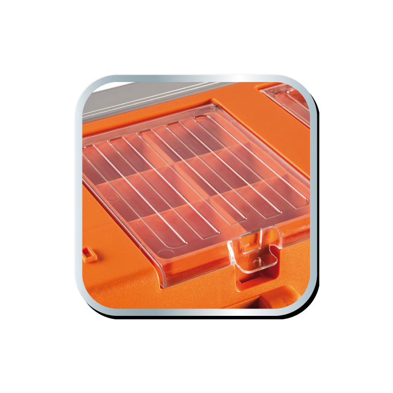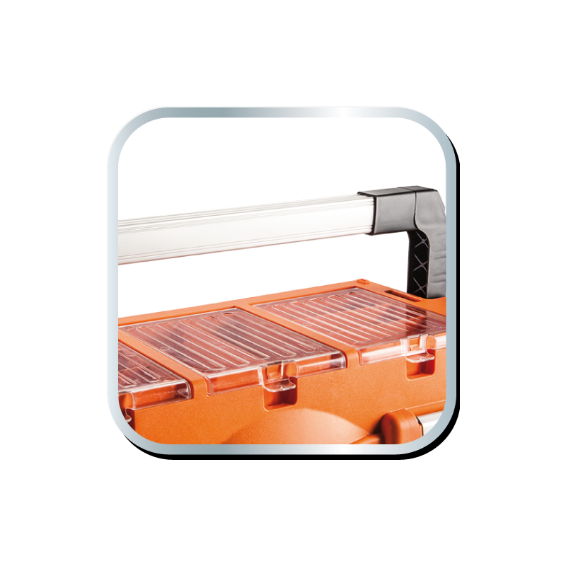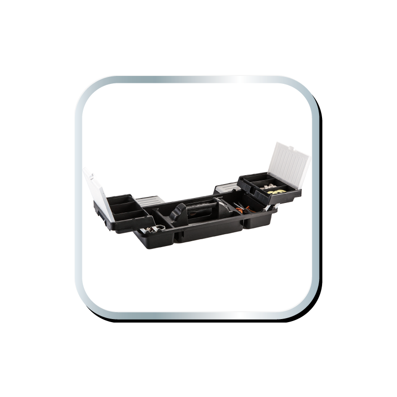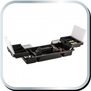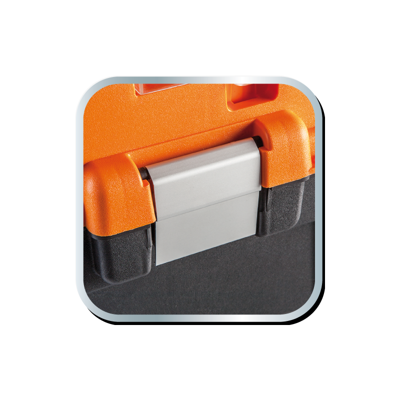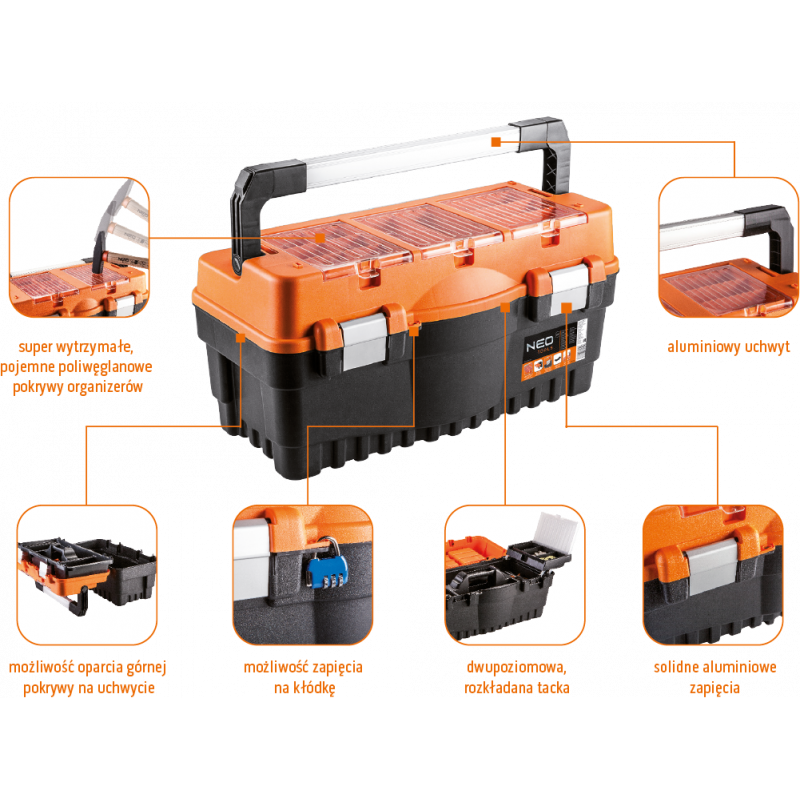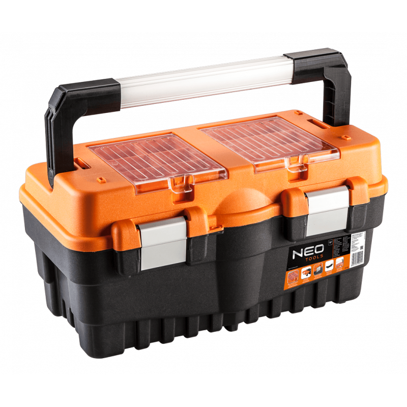 Skrzynka narzędziowa 18" NEO (nr ref. 84-102) wymiary 46.2 x 25.6 x 24.2 cm, aluminiowy uchwyt, aluminiowe zatrzaski, 2 organizery, poliwęglanowe pokrywy organizerów, rozkładana tacka, miejsce na kłódkę