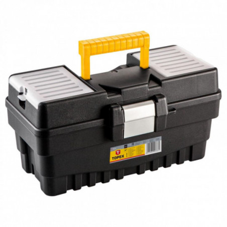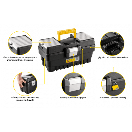 Skrzynka narzędziowa 15", organizery, nosidło, aluminiowe zatrzaski, plastikowy uchwyt, boczne uchwyty