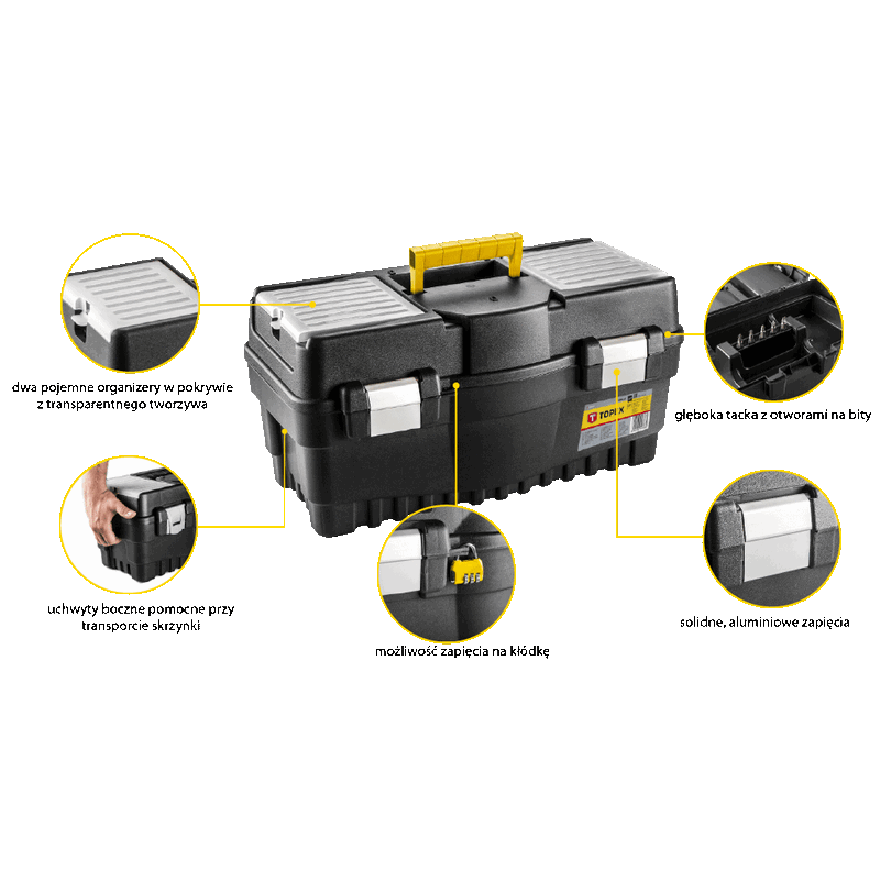 Skrzynka narzędziowa 22", organizery, nosidło, aluminiowe zatrzaski, plastikowy uchwyt, boczne uchwyty