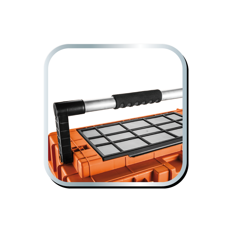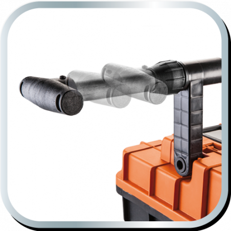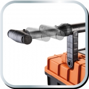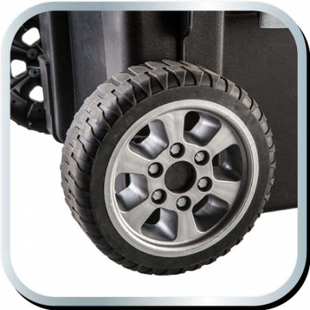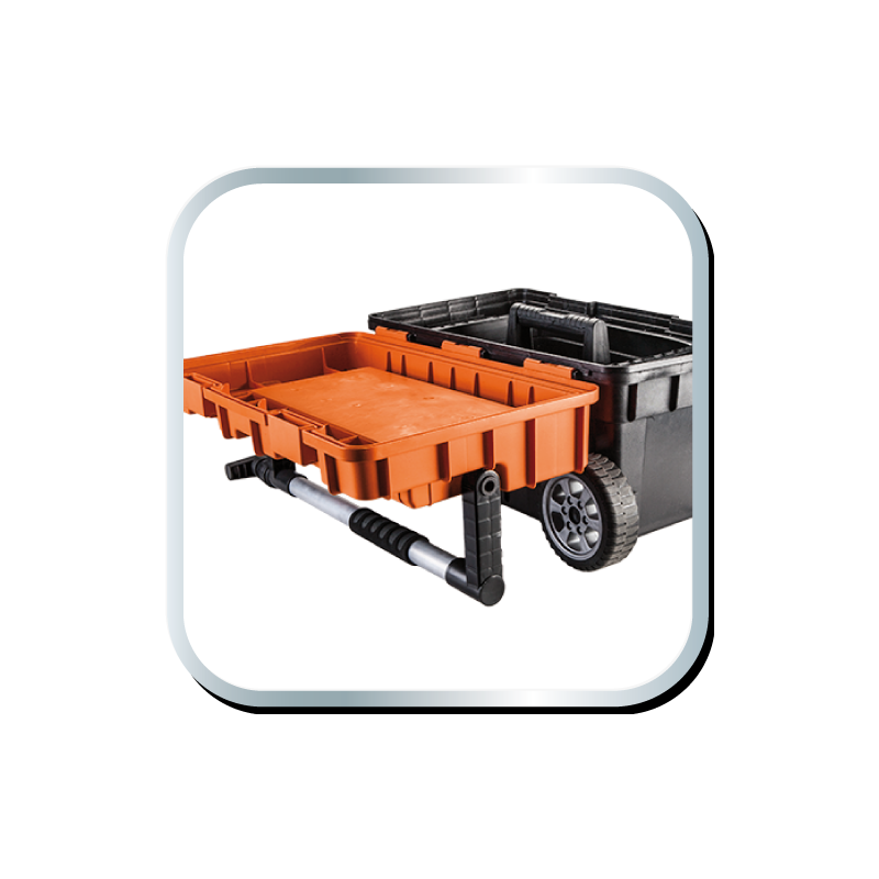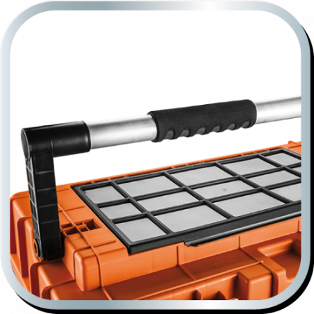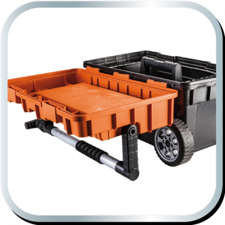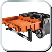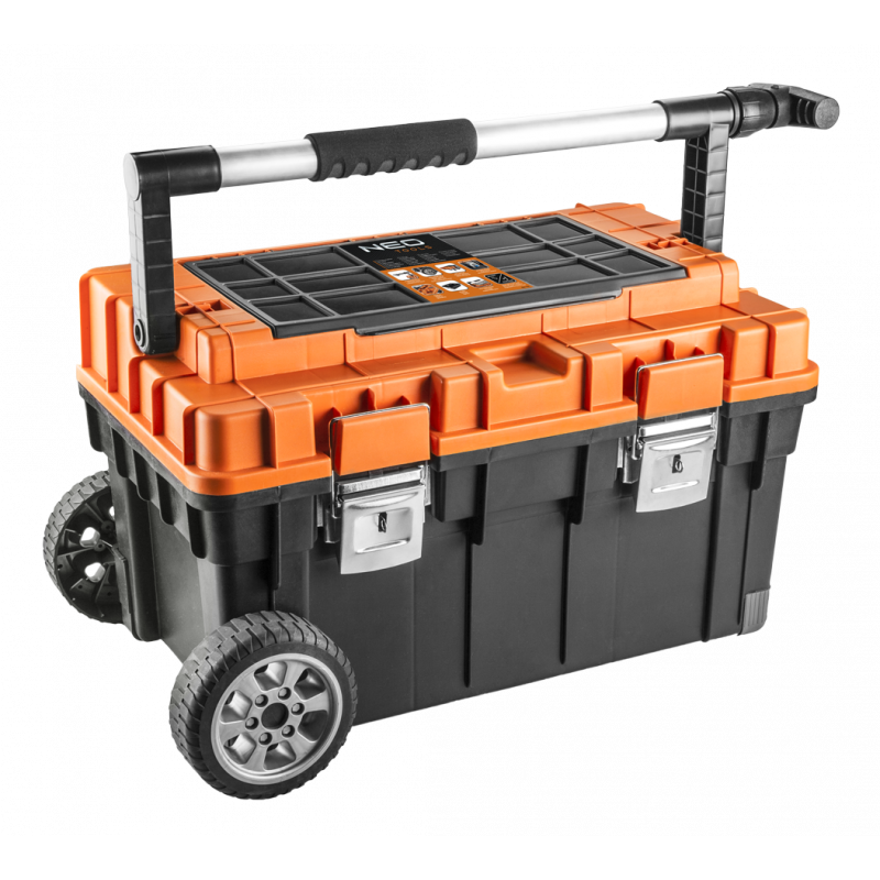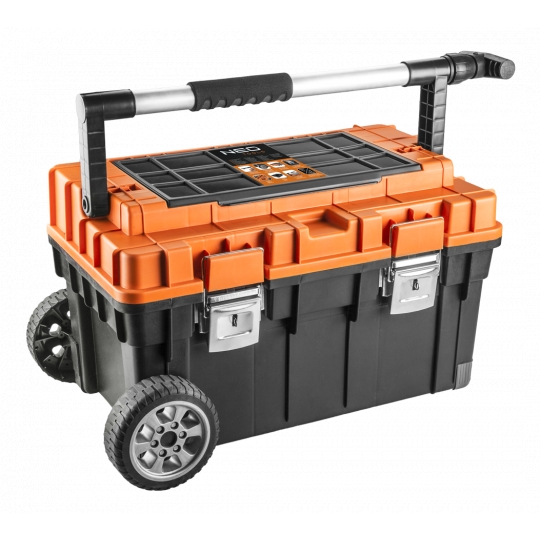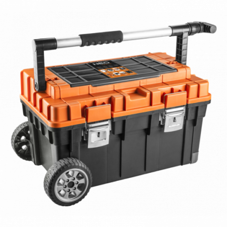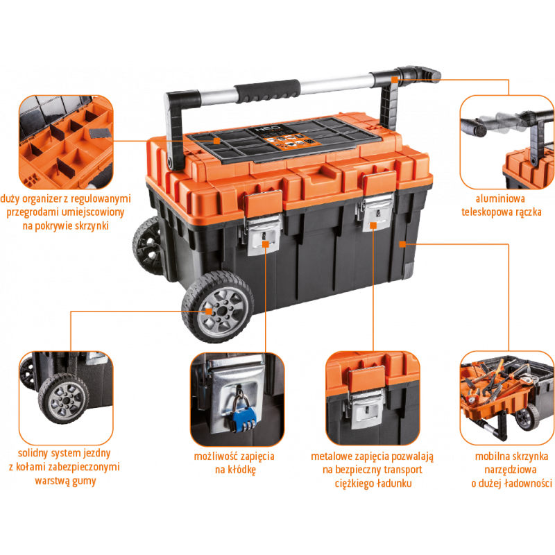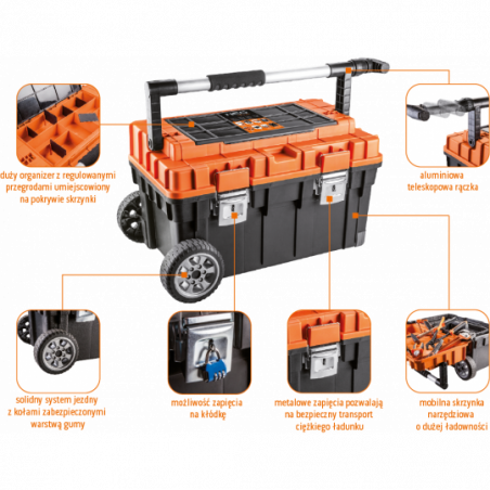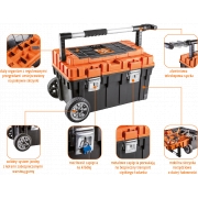 Skrzynka narzędziowa, dwa koła pokryte gumą, metalowe zatrzaski, organizer, alumniowy, teleskopowy uchwyt, nosidło
