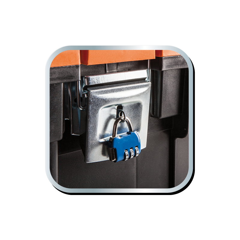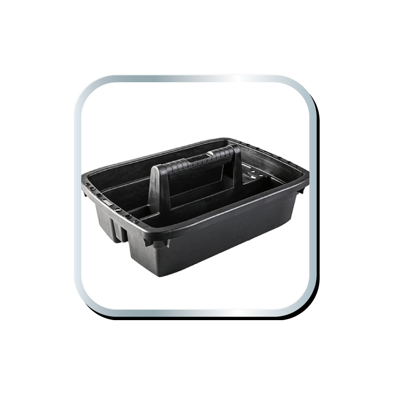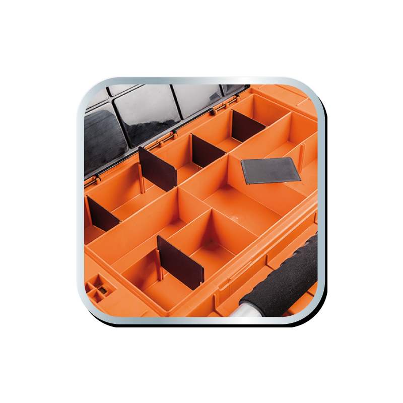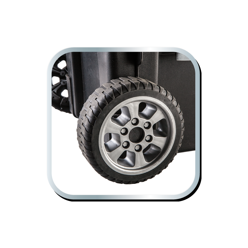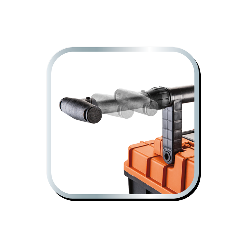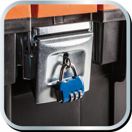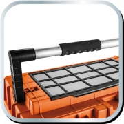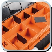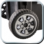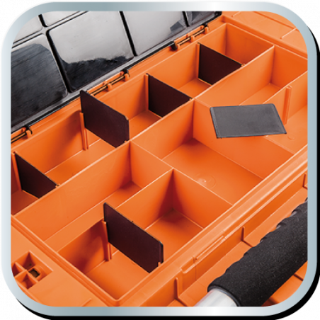 Skrzynka narzędziowa, dwa koła pokryte gumą, metalowe zatrzaski, organizer, alumniowy, teleskopowy uchwyt, nosidło