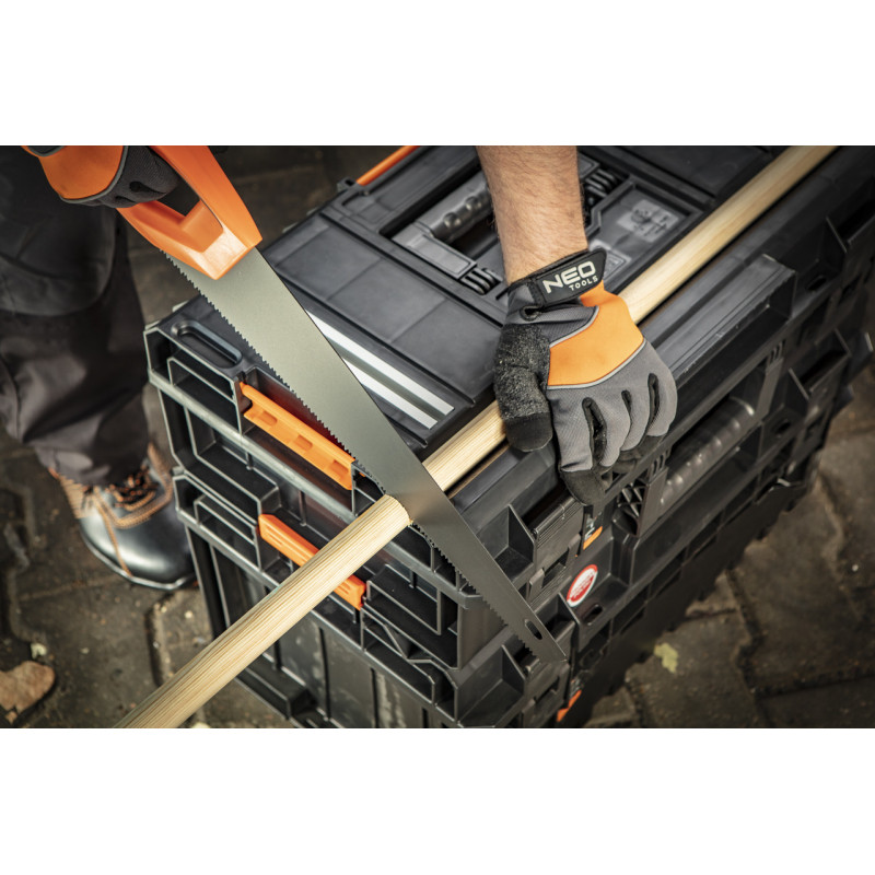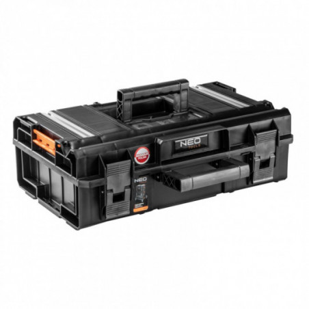 Skrzynka modułowa (nr. ref 84-265) dwie prowadnice na ściski w pokrywie, 2 regulowane przegrody, 6 pojemników, solidne zapięcia, mocny uchwyt, uszczelka w pokrywie, odporność na pył i wodę, modularna konstrukcja, żebra wzmacniające, wnęka do przycinania z miarą nośność 50kg.