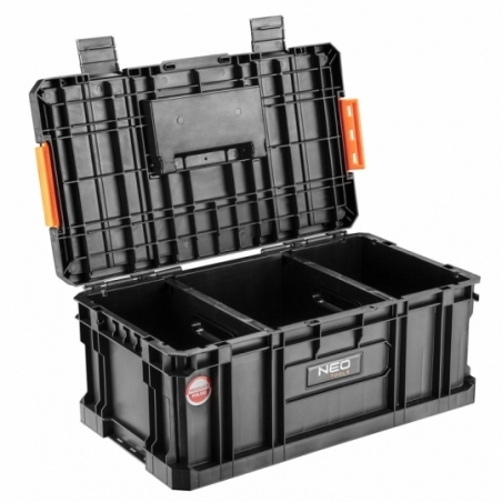 Skrzynka modułowa 200 (nr. Ref 84-061) dwa organizery w pokrywie, 2 regulowane przegrody, solidne zapięcia, mocny uchwyt, odporność na pył i wodę, modularna konstrukcja, żebra wzmacniające, 6 kubełków, wnęka do przycinania z miarą nośność 19kg.