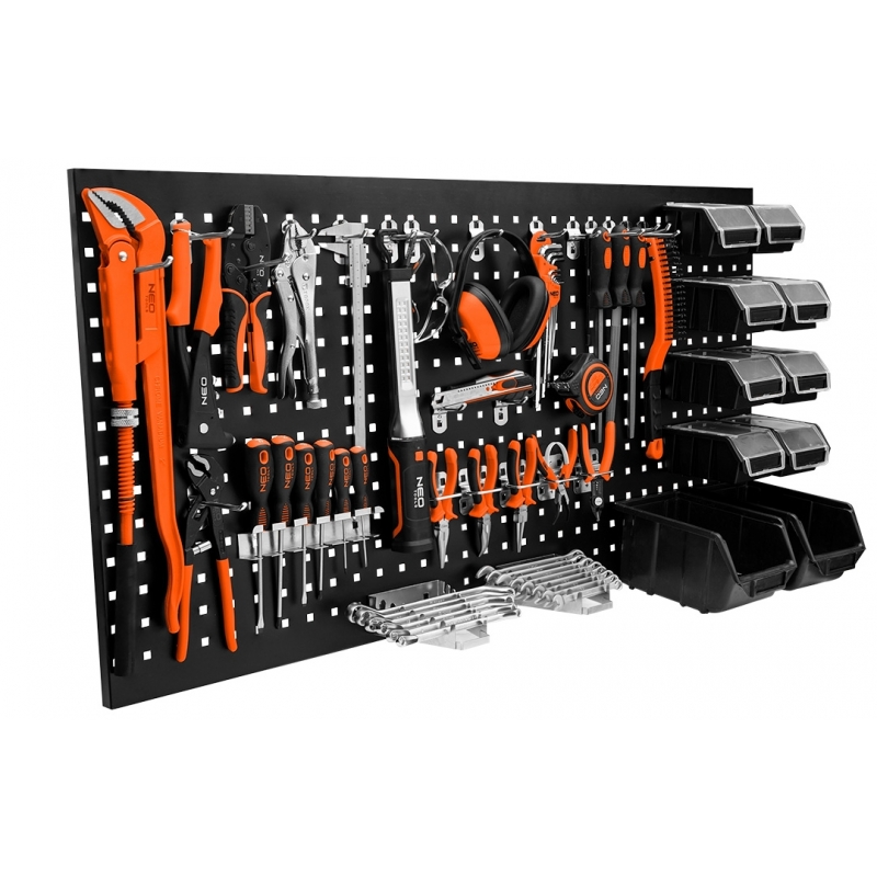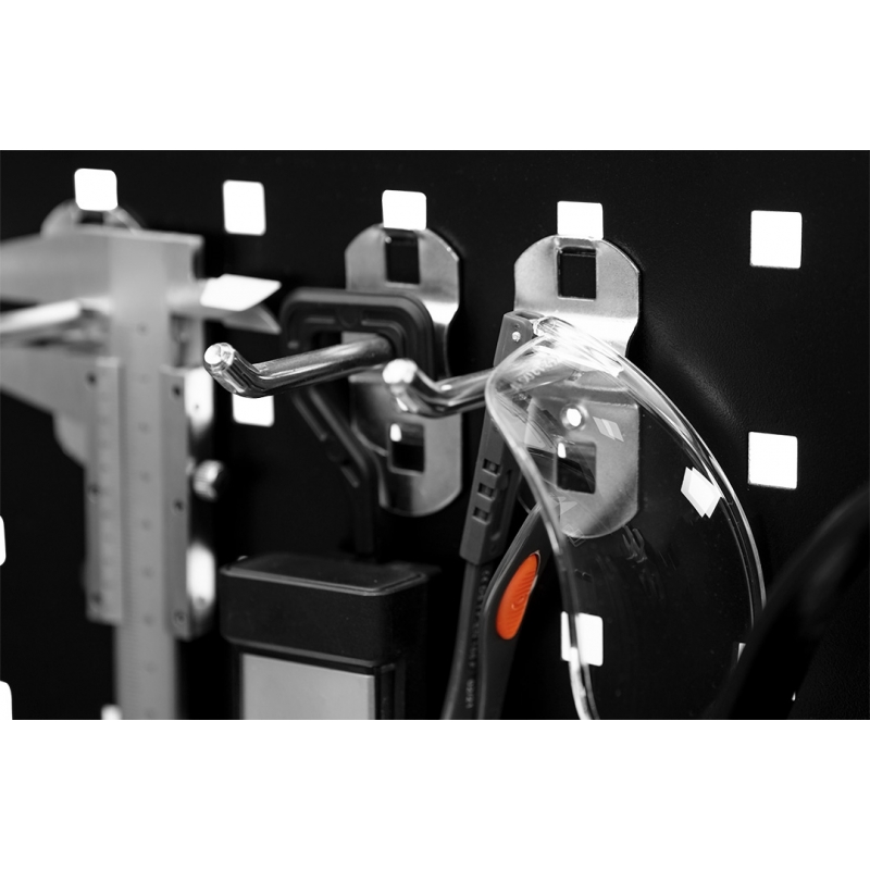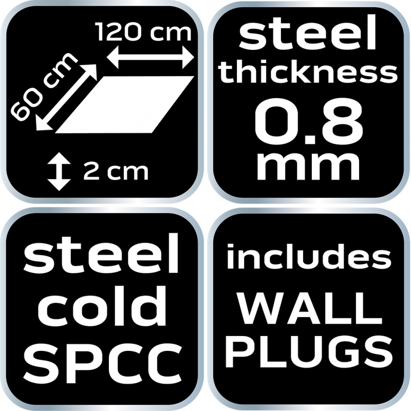 Panel narzędziowy wymiar 120 cm szerokość, 60 cm wysokość, 2 cm głębokość, stal SPCC o grubości 0.8mm, zawiera kołki rozporowe, kompatybilne z hakami 84-502, 84-503, 84-092, 84-093, 84-094, 84-095, 84-096, 84-097, 84-098