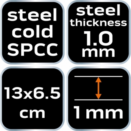 Hak na box duży, rozmiar 13x6.5 cm, stal SPCC, grubość stali 1mm, do zawieszenia pojemników magazynowych na perforacjach narzędziowych, kompatybilne z perforacją narzędziową Neo 84-500 i 84-501
