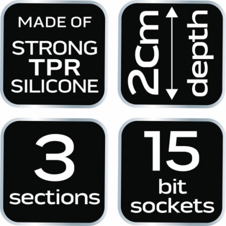 Kuweta na narzędzia, silikonowa, 27.5 x 14.5 x 2.5 cm, 3 kieszenie, 15 uchwytów na bity, głębokość 20 mm, elastyczna, antypoślizgowa, ochronna.