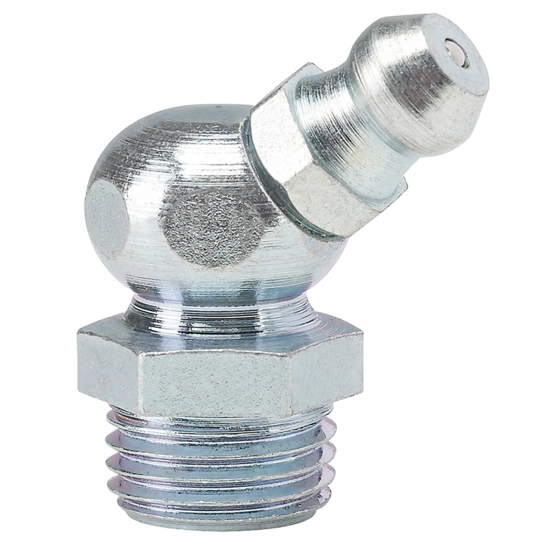 Smarowniczka stożkowa, zagięta H2, M10x1, kąt zagięcia 45o, (H1) całkowita 26 mm, (H2) do podstawy sześciokąta 5 mm, stal utwardzana, galwanizowana