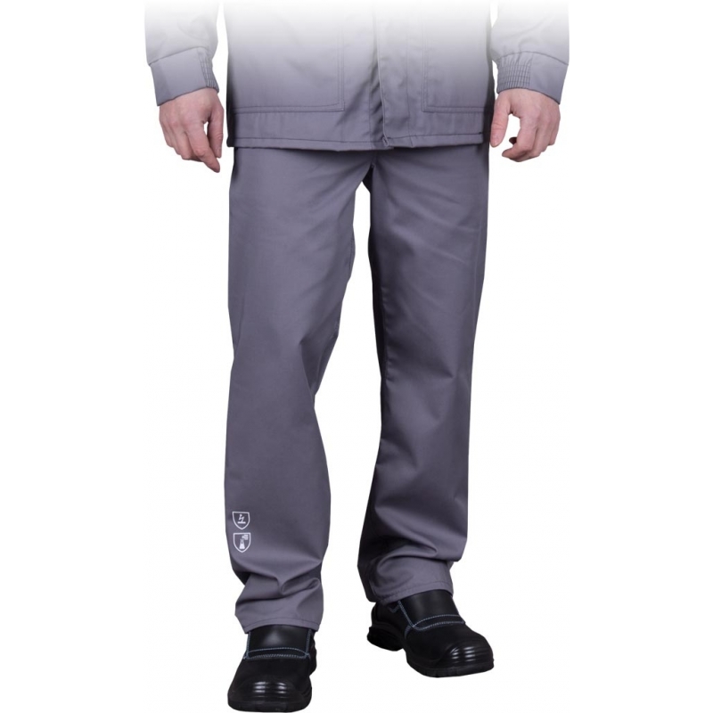 Antyelektrostatyczne spodnie ochronne chroniące przed ciekłymi chemikaliami. - 64% poliester, 34% bawełna, 2% włókna węglowe - gramatura 250 g/m2 - spodnie do pasa zapinane na guziki - dwie kieszenie boczne oraz dodatkowa kieszeń na prawej nogawce - z tyłu pas z gumą do regulacji obwodu - spodnie przeznaczone do ochrony użytkownika na stanowiskach na których występuje zagrożenie ciekłymi chemikaliami w sytuacjach potencjalnego narażenia na drobno rozpyloną ciecz lub rozbryzgi o niewielkim ciśnieniu i objętości, przed którymi nie jest wymagana całkowita bariera na przenikanie cieczy na poziomie molekularnym (Typ PB[6] odzieży) oraz do prac w środowisku, w którym wymagana jest zdolność do rozpraszania ładunku elektrostatycznego w celu zapobiegania wyładowaniom zapalającym - zgodne z normami: EN ISO 13688, EN 13034, EN 1149