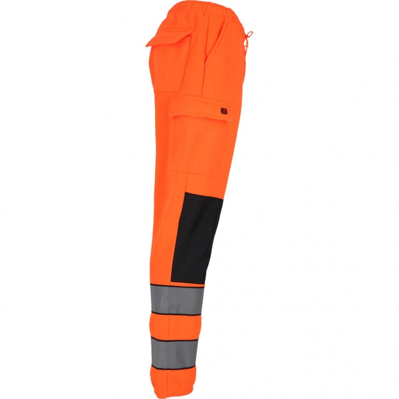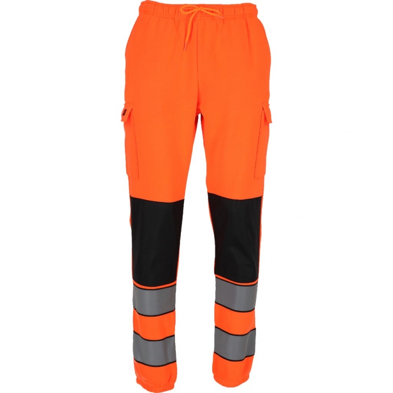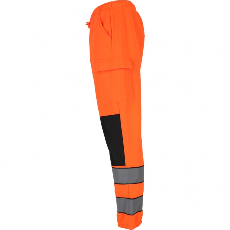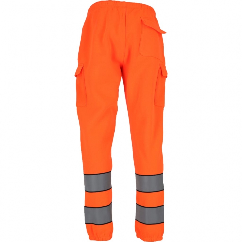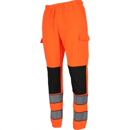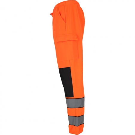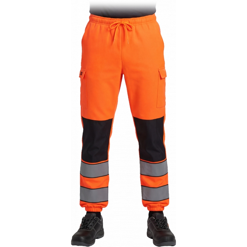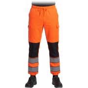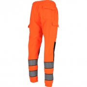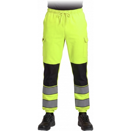 RAW-POL LUMIS to męskie spodnie ochronne dresowe wykonane z dzianiny poliestrowej o gramaturze 280 g/m², wyposażone w kieszenie boczne, tylną kieszeń oraz kieszenie na nogawkach zapinane na rzep. Fluorescencyjna tkanina i pasy odblaskowe zwiększają widoczność podczas pracy i codziennego użytkowania.