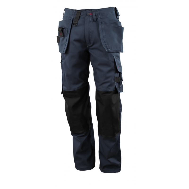 Wytrzymałe potrójne szwy wydłużające żywotność produktu.; Ergonomiczny kształt nogawek opracowany zgodnie z ruchem ciała; Wzmocnione kieszenie wiszące z dodatkowymi kieszeniami i paskami na narzędzia.; Kieszenie na kolanach wzmocnione tkaniną CORDURA®, z wejściem od góry na nakolanniki oraz klapką, dzięki czemu nie gromadzi się brud.; Dodatkowa widoczność dla otoczenia dzięki zastosowaniu pasków refleksyjnych.; Certyfikowane do użytku z wkładkami ochronnymi MASCOT typu SHORT lub LONG (wysokość kieszeni na kolanach jest regulowana).