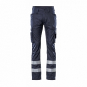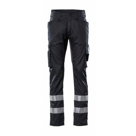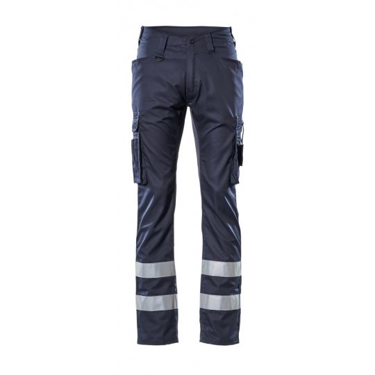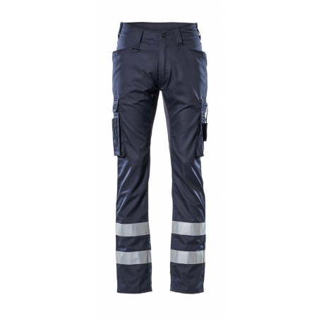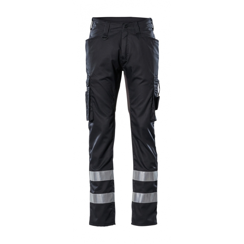 Niska waga tkaniny oraz wysoka odporność na zużycie.; Duża liczba wkładek z elastycznego materiału zapewnia niezwykłą swobodę poruszania się.; Ergonomiczny kształt nogawek opracowany zgodnie z ruchem ciała; Praktycznie zaprojektowane kieszenie na udach – z lewej strony zamykana na magnetyczną klapkę kieszonka na telefon, z prawej strony kieszeń na długopis i specjalnie dopasowana kieszeń na latarkę.; Zdejmowany uchwyt na identyfikator, łatwo mocowany do kieszeni na udzie lub do zaczepu w kształcie litery D. Pasuje też do wszystkich innych produktów z zaczepem D.; Paski odblaskowe o najwyższym stopniu odblaskowości biegną dookoła nogawki i zwiększają widoczność pracownika dla otoczenia.