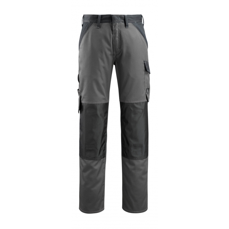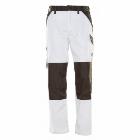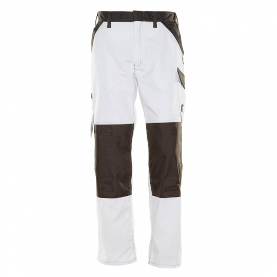 Wytrzymałe potrójne szwy na nogawkach i w kroku zwiększają żywotność produktu.; Nogawka ergonomicznie skrojona z tyłu, aby nadmiar materiału nie przeszkadzał podczas prac w pozycji klęczącej.; Regulowane kieszenie na kolanach umożliwiają odpowiednie umieszczenie nakolanników.; Ciemna tkanina jest umieszczona w miejscach najbardziej narażonych na zabrudzenie.; Standardowo o trzech długościach nogawek, co pozwala na wygodne dopasowanie i optymalne rozmieszczenie detali zgodnie z indywidualnym wyborem.; Produkt nadaje się do prania przemysłowego.; Certyfikowane do użytku z wkładkami ochronnymi MASCOT typu SHORT lub LONG (wysokość kieszeni na kolanach jest regulowana).