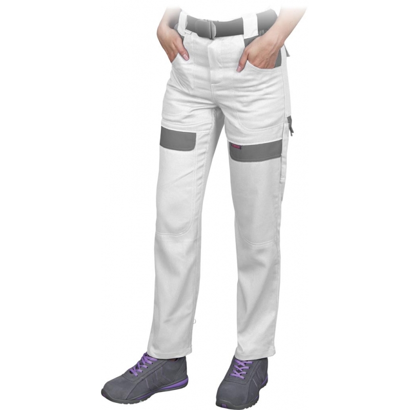 Spodnie ochronne do pasa CORTON, damskie. - tkanina: 100% bawełna - gramatura 260 g/m2 - dwie boczne kieszenie oraz dwie tylne zapinane na rzep - kieszenie na nogawkach, w tym jedna na narzędzia - możliwość regulacji w pasie dzięki gumce w bocznych partiach - odblaskowe elementy