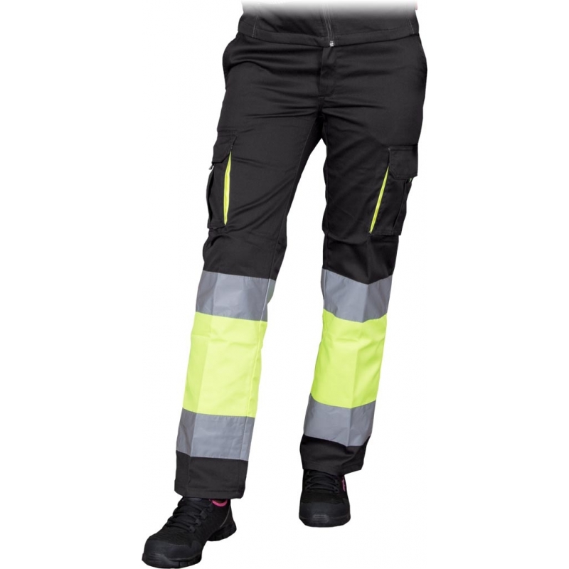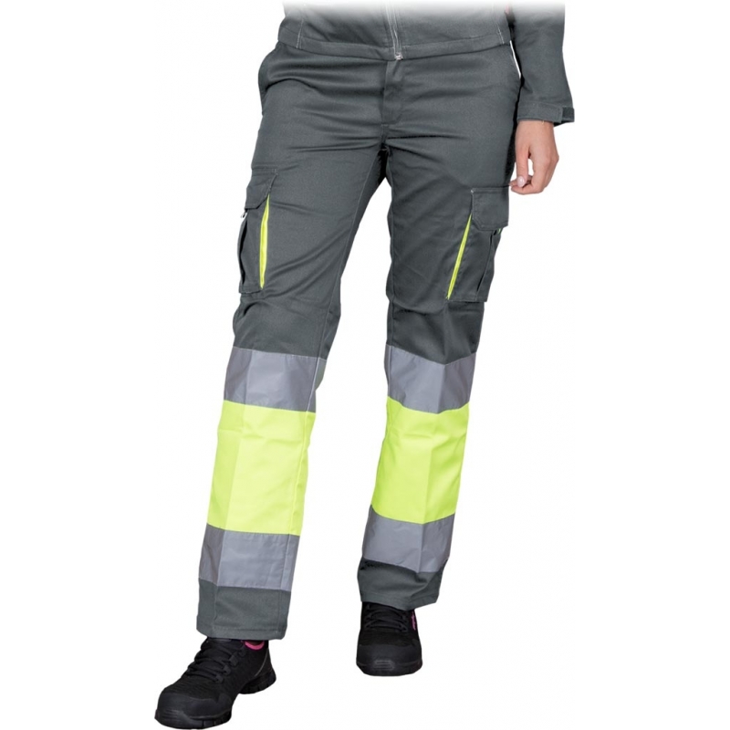 Elastyczne spodnie ochronne do pasa FRAUBAX, damskie. - 62% poliester, 35% bawełna, 3% elastan o gramaturze 240 g/m2 - wstawki z kontrastowego materiału 65% poliester, 35% bawełna o gramaturze 210 g/m2 - zapinane na guzik i zamek błyskawiczny - dwie boczne kieszenie oraz dwie tylne zapinane na rzep - dwie kieszenie na nogawkach zapinane na rzep - gumka w pasie w tylnej partii zwiększa swobodę ruchów oraz umożliwia lepsze dopasowanie - spodnie chronią podczas pracy, zapewniając przy tym dużą wygodę - pasy odblaskowe zapewniają lepszą widoczność - testowane na zawartość szkodliwych dla zdrowia substancji zgodnie ze standardami OEKO-TEX® Standard 100