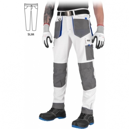 Spodnie ochronne do pasa FORMEN, męskie. - materiał główny: tkanina o splocie twill 62% poliester, 35% bawełna, 3% elastan o gramaturze 250 g/m2 - wstawki: tkanina 100% poliester Oxford 600D o gramaturze 270 g/m2 oraz elementy z tkaniny Cordura - zapinane na guzik oraz zamek błyskawiczny - dwie podwójne kieszenie boczne oraz dwie tylne zapinane na rzep - kieszenie na nogawkach, w tym jedna podwójna zapinana na rzep z przegródkami na akcesoria oraz jedna podłużna z przegródkami - kieszenie na wkładki nakolannikowe wkładane od góry z zapięciem na rzep - gumka w pasie umożliwiająca lepsze dopasowanie - końcówka do przypięcia kluczy - uchwyt na młotek na prawej nogawce - odblaskowe elementy - fason: SLIM - testowane na zawartość szkodliwych dla zdrowia substancji zgodnie ze standardami OEKO-TEX® Standard 100