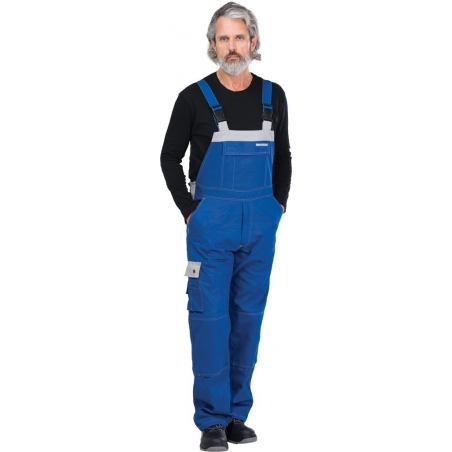 Spodnie ochronne ogrodniczki. - 100% bawełna - gramatura 300 g/m2 - cztery kieszenie: dwie boczne i dwie tylne na rzep - duża kieszeń na rzep w górnej partii ogrodniczek - dodatkowe kieszenie na nogawkach, w tym na telefon komórkowy - w tylnej części ściągacz w pasie, dzięki czemu spodnie dopasowują się do sylwetki - gumki w szelkach, ułatwiające swobodne poruszanie się - końcówka do przypięcia kluczy - na kolanach kieszenie na wkładki nakolannikowe KING BEE - charakteryzuje się zwiększoną wytrzymałością