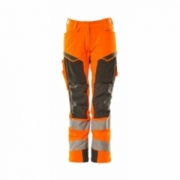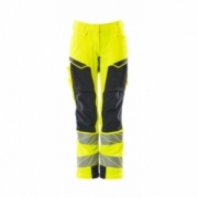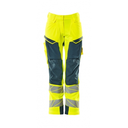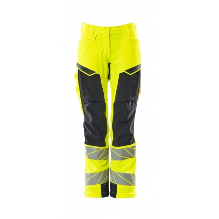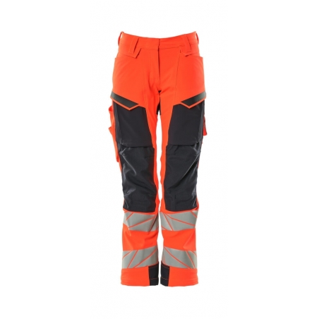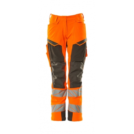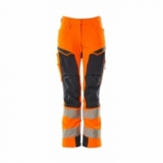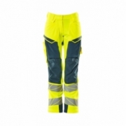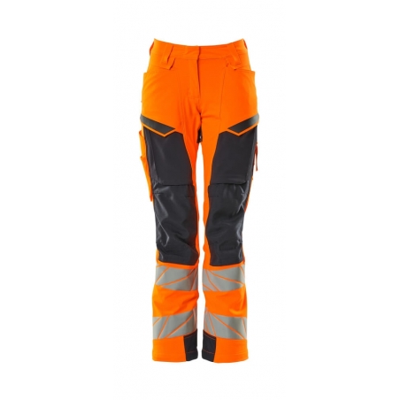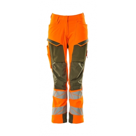 Krój Diament zaprojektowany jest specjalnie dla kobiet, u których różnica pomiędzy obwodem talii i bioder jest większa niż 20 cm.; Materiał streczowy rozciąga się we wszystkich kierunkach, co zapewnia użytkownikowi niezrównaną swobodę ruchu, bez ucisku i ocierania.; Wielofunkcyjny materiał streczowy łączy niską wagę z bardzo dużą trwałością. Jest przy tym wodoodporny.; Produkt nadaje się do prania przemysłowego.; Kieszeń na calówkę posiada wzmocnienia z Kevlar®-szczególna odporność na działanie spiczastych i ostrych przedmiotów.; Wykonane z trwałego materiału CORDURA® kieszenie na nakolanniki umożliwiają regulację i dobranie optymalnego położenia.; Skuteczna wentylacja nóg dzięki zamkowi błyskawicznemu w tylnej części uda.; Możliwość zastosowania kieszeni wiszących 19450-126 dopinanych za pomocą guzików.; Certyfikowane do użytku z wkładkami ochronnymi MASCOT typu SHORT lub LONG (wysokość kieszeni na kolanach jest regulowana).