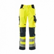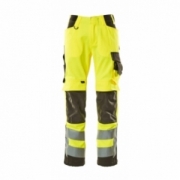 Wytrzymałe potrójne szwy na nogawkach i w kroku zwiększają żywotność produktu.; Obróbka powierzchni sprawia, że produkt jest odporny na zabrudzenia i zapewnia wysoką widoczność.; Możliwość prostego wydłużenia o 3 cm poprzez rozprucie czerwonego przeszycia z tyłu.; Kieszenie na kolanach wzmocnione tkaniną CORDURA® z wejściem od góry na nakolanniki, z zapięciem na rzepy po zewnętrznej stronie klapki, co zapobiega zaczepianiu się joysticków itp.; Ergonomiczny kształt nogawek opracowany zgodnie z ruchem ciała; Produkt nadaje się do prania przemysłowego.; Certyfikowane do użytku z wkładkami ochronnymi MASCOT typu SHORT lub LONG (wysokość kieszeni na kolanach jest regulowana).