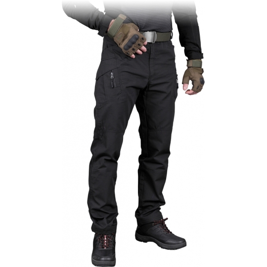 Spodnie ochronne do pasa Tactical Guard. - 65% poliester, 35% bawełna - gramatura 210-220 g/m2 - zapinane na guzik i zamek błyskawiczny - gumka w pasie w tylnej partii zwiększa swobodę ruchów oraz umożliwia lepsze dopasowanie - dwie kieszenie z tyłu oraz jedna dodatkowa na przybory - dwie przednie kieszenie - dwie kieszenie na nogawkach zapinane na suwak oraz dwie zapinane na rzep - końcówka do przypięcia kluczy - na kolanach dodatkowe wzmocnienie co zwiększa wytrzymałość spodni na przetarcia - dedykowane dla miłośników militariów, motocyklistów, motorowerzystów, podróżników, fanów paintballu - idealne dla firm ochroniarskich, leśników i rybaków
