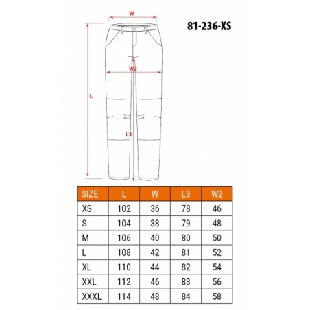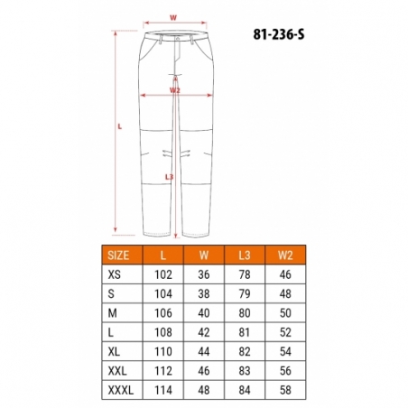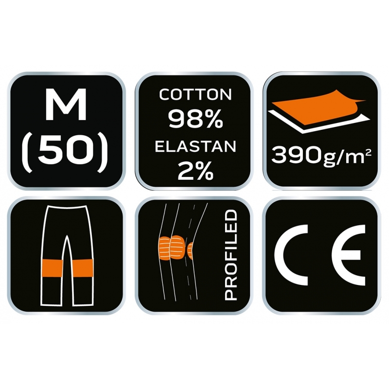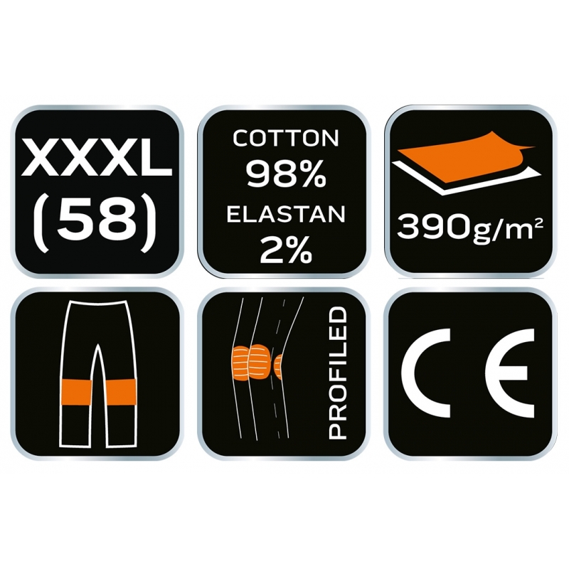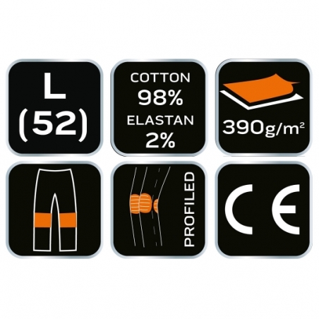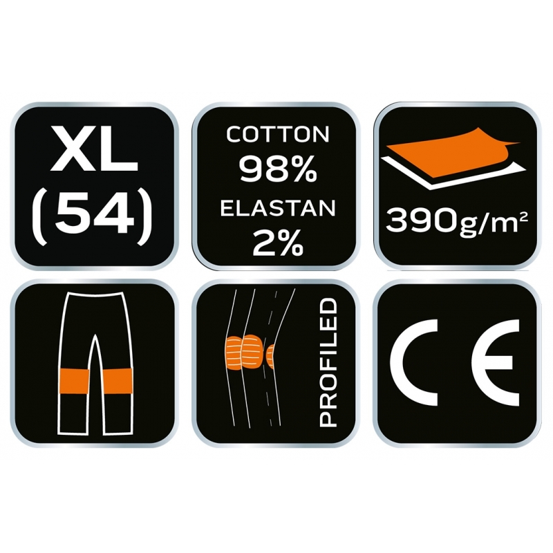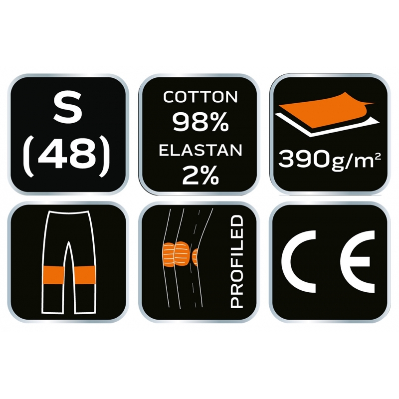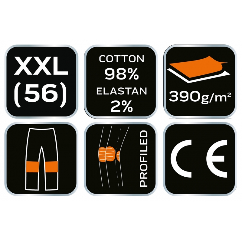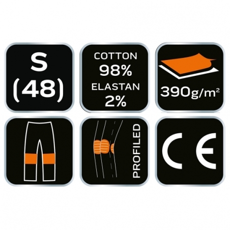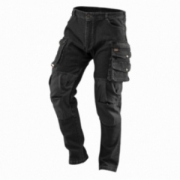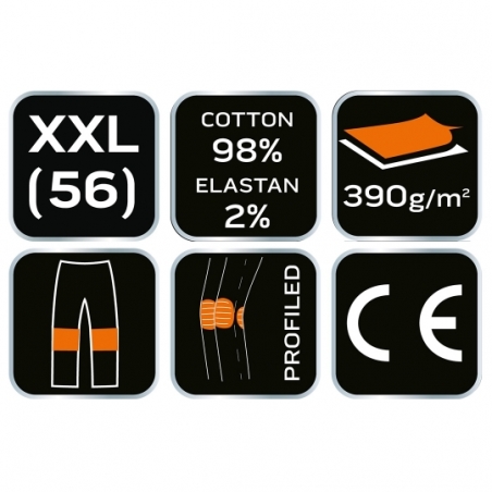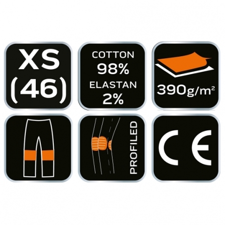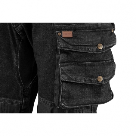Spodnie robocze DENIM, czarne, wzmocnienia na kolanach, 98% bawełna, 2% elastan, dodatek elastanu zapewnia lepsze dopasowanie i większy komfort noszenia, wielofunkcyjne i pojemne kieszenie, w kroku i pod kolanem panel z bawełnianego Oxfordu podnoszący komfort użytkowania, profilowane kolano, dodatkowa kieszeń na dole nogawki, skórzane wszywki z logo, wewnętrzna wszywka imienna, unikalny projekt własny, certyfikat CE, zgodność z normą EN ISO 13688:2013, rozmiar XS
