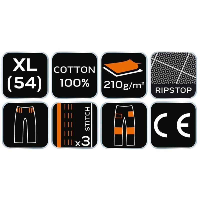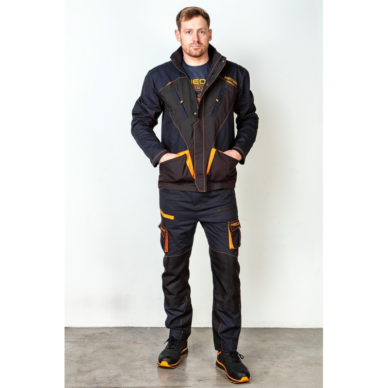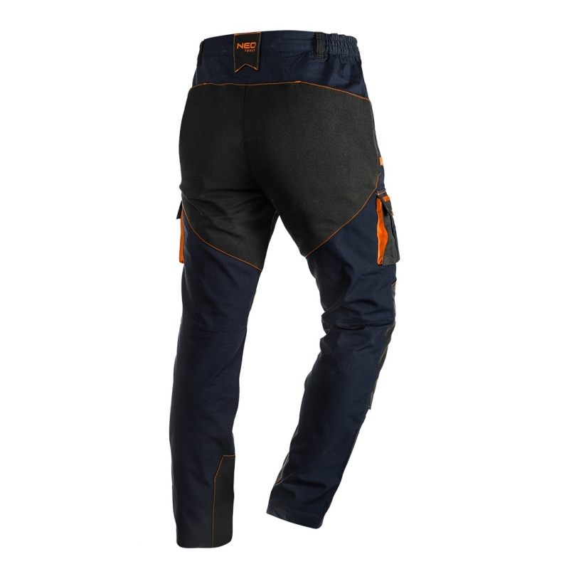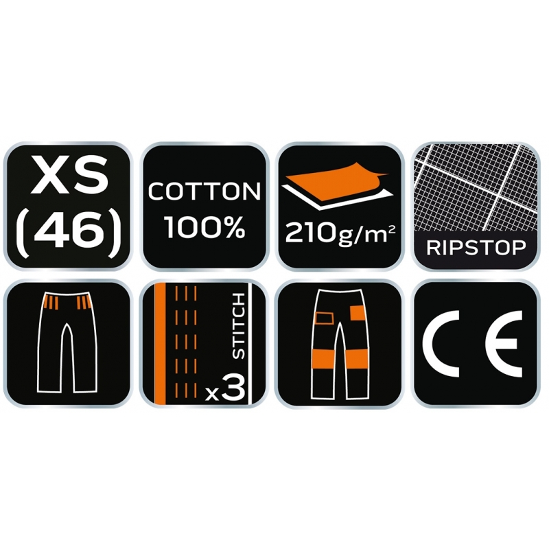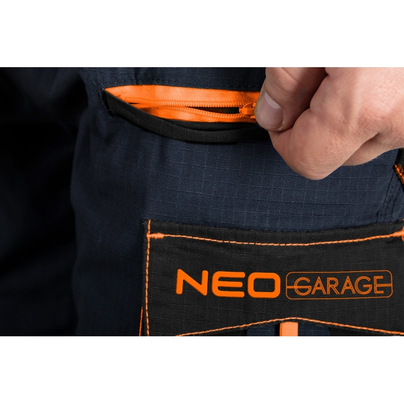 Spodnie robocze Neo Garage, rozmiar XS, skład tkaniny 100% bawełna, gramatura 210 g/m2, wykonanie z bawełnianej tkaniny typu ripstop zapewnia wysoką trwałość i zwiększoną odporność na rozerwanie, unikalny projekt własny, elastyczna guma w pasie, dodatkowe wzmocnienia z tkaniny Oxford w miejscach narażonych na przetarcia, wielofunkcyjne i pojemne kieszenie, potrójne szwy nogawek, kieszenie na nakolanniki, wewnętrzna wszywka imienna, , elementy neonowe, certyfikat CE na zgodność z normą EN ISO 13688:2013