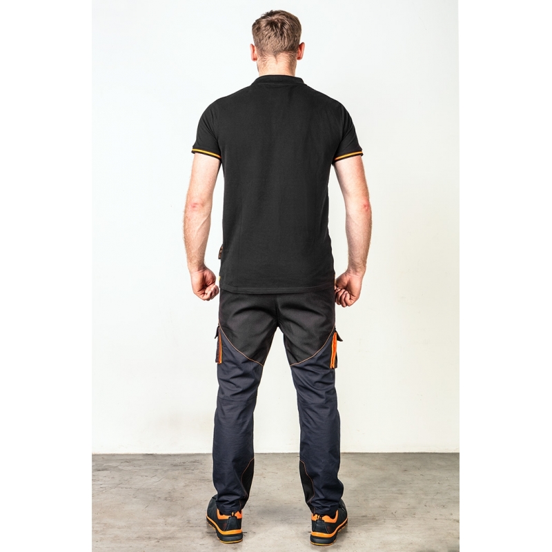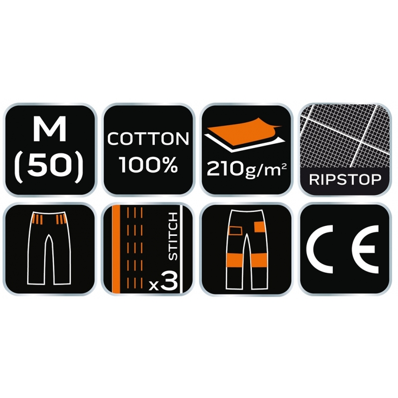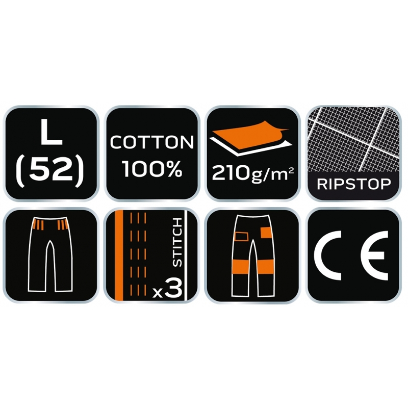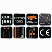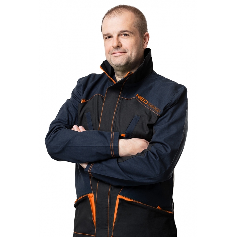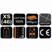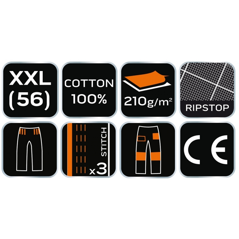 Spodnie robocze Neo Garage, rozmiar XS, skład tkaniny 100% bawełna, gramatura 210 g/m2, wykonanie z bawełnianej tkaniny typu ripstop zapewnia wysoką trwałość i zwiększoną odporność na rozerwanie, unikalny projekt własny, elastyczna guma w pasie, dodatkowe wzmocnienia z tkaniny Oxford w miejscach narażonych na przetarcia, wielofunkcyjne i pojemne kieszenie, potrójne szwy nogawek, kieszenie na nakolanniki, wewnętrzna wszywka imienna, , elementy neonowe, certyfikat CE na zgodność z normą EN ISO 13688:2013
