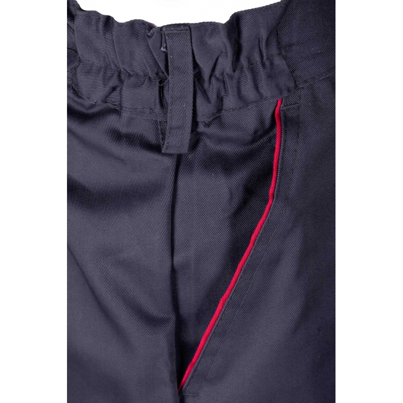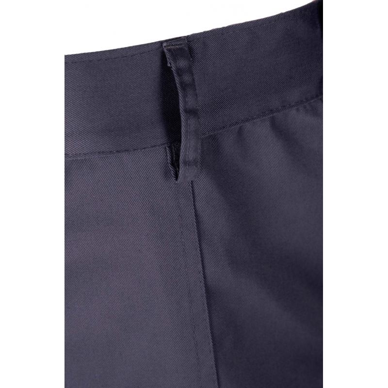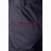 Model posiada lamówkę kolorową, szlufki na pasek oraz praktyczne kieszenie, w tym kieszeń na miarkę „metrówkę”. Regulacja obwodu w pasie odbywa się za pomocą gumki, co zwiększa komfort użytkowania.
